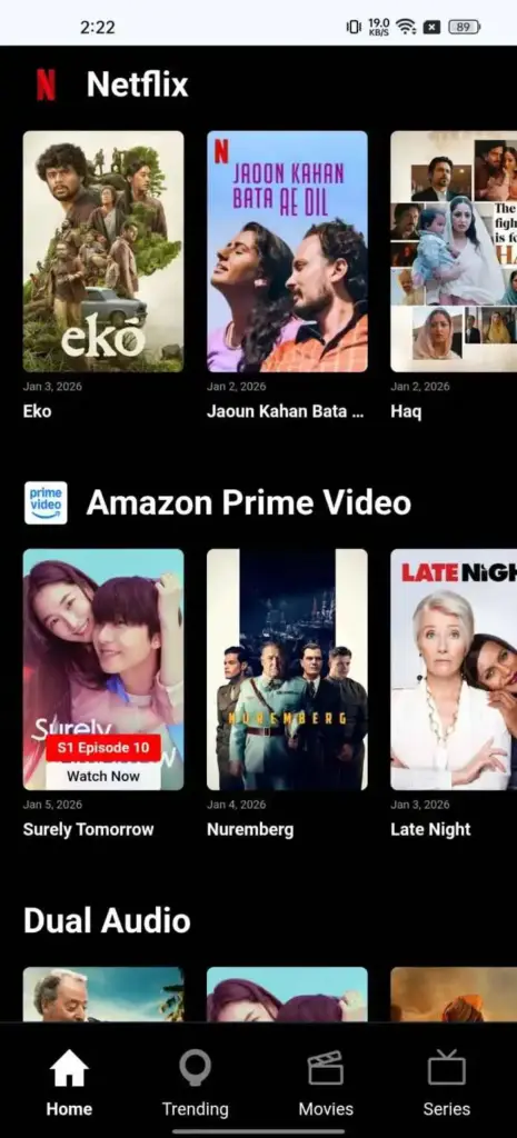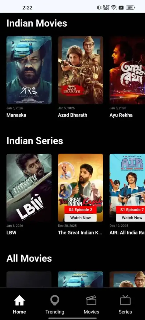The app has a clean and well-organized content library. Movies, TV shows, anime, and other content are sorted by categories, genres, and sections, making it easy for users to browse and find what they want to watch.